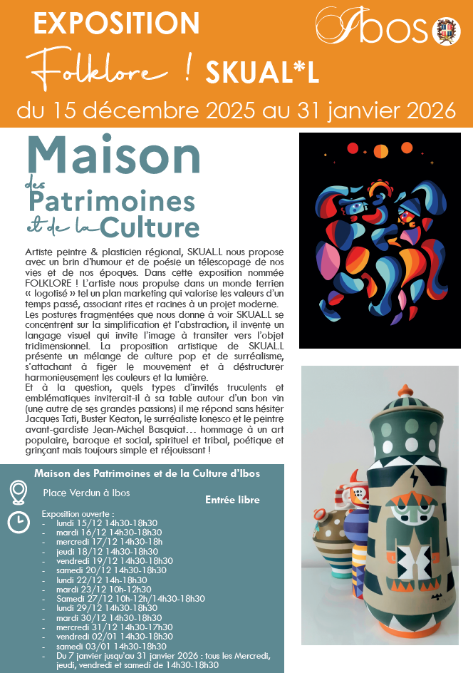Du 15 décembre au 31 janvier, venez découvrir l’exposition Folklore de SKUAL*L à la Maison des Patrimoines et de la Culture d’Ibos située place Verdun.